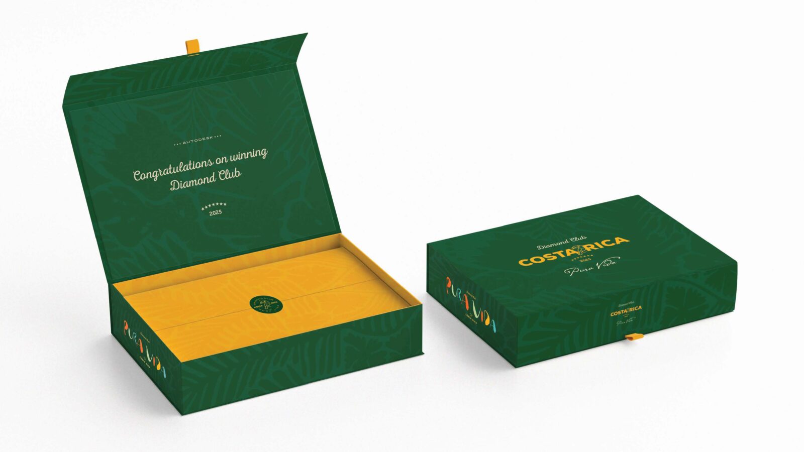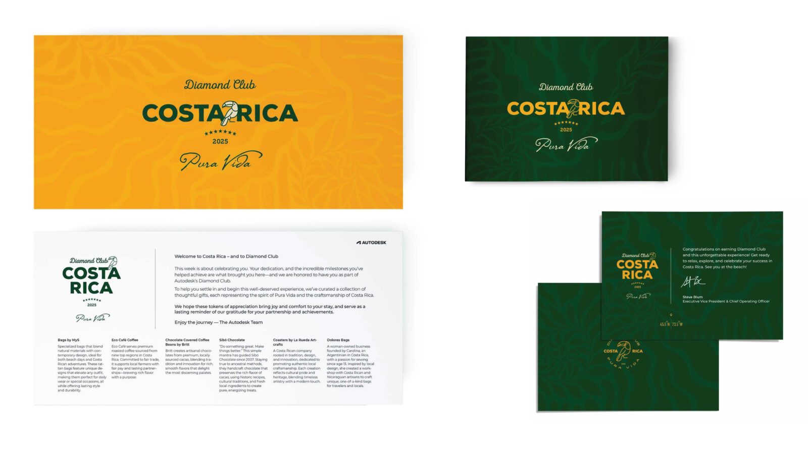 Autodesk rewards its top salespeople with an all-expenses-paid incentive trip each year. This years destination – Costa Rica. We designed the full brand identity for the Autodesk Diamond Club, bringing the experience to life through bold typography, rich color, playful illustration, and lush imagery, vibrant, inclusive, and polished for executives and families alike. We also produced the location reveal video to kick off the excitement.